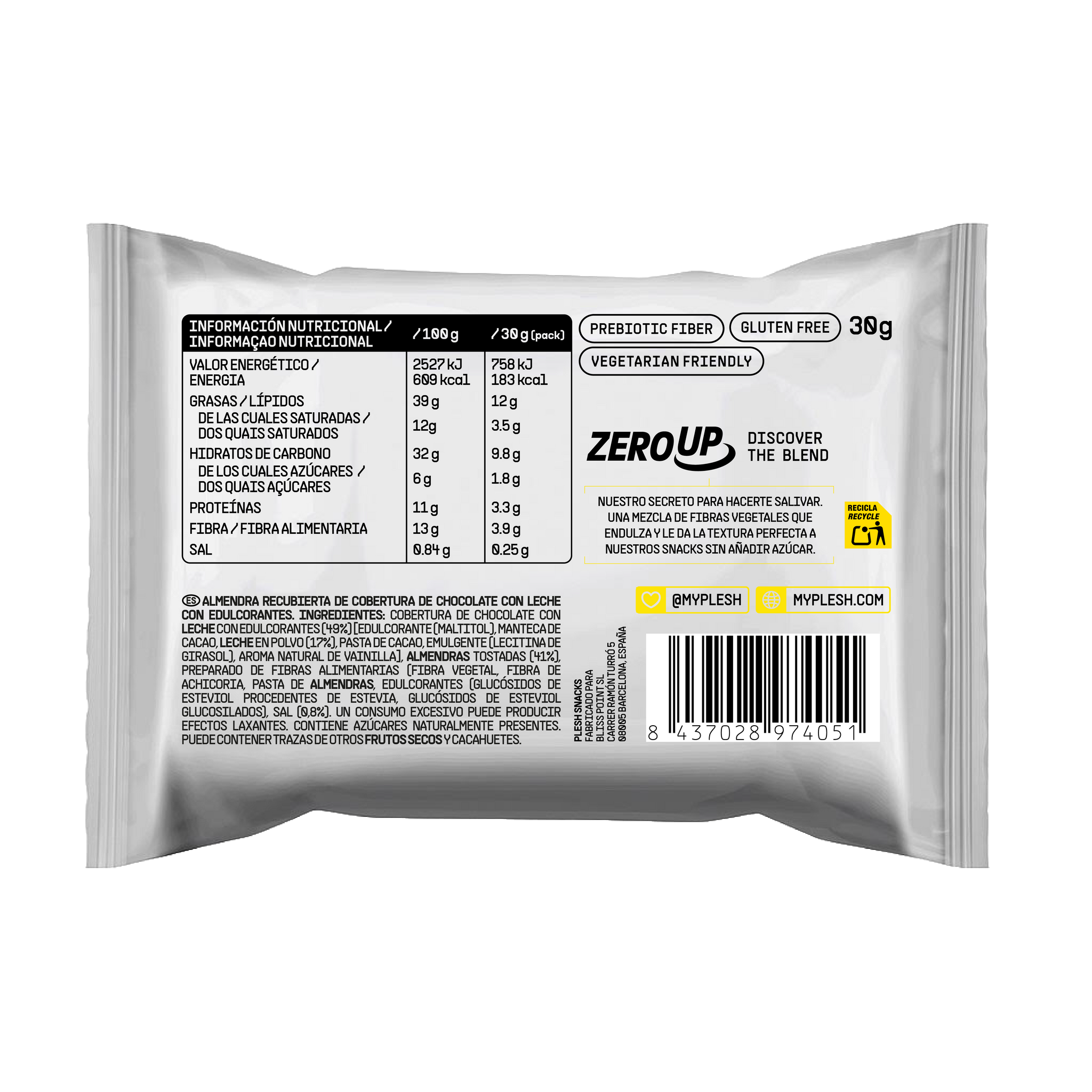 Almendras tostadas cubiertas de chocolate con leche y caramelo salado.